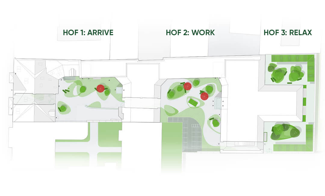 Work and relax. Two things that go great together. The third courtyard gives you that little bit of extra space. Cosy, green, quiet – a place where you can get away from it all. During your lunch break, after work or for a little timeout at any time of day.